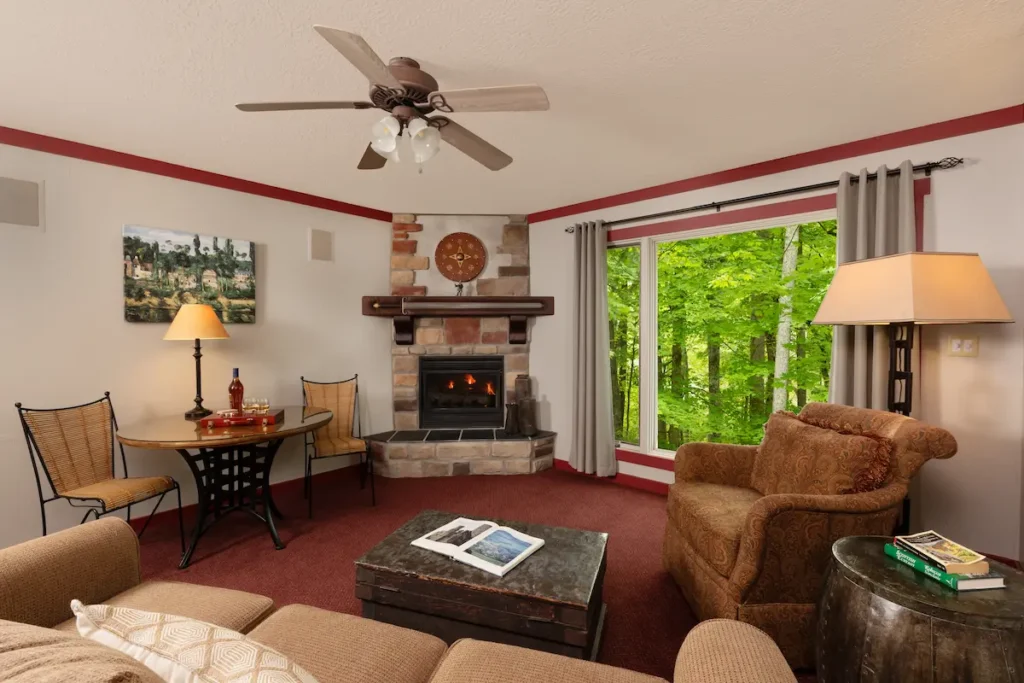 Our inviting stone fireplaces and Franklin stoves complete our restful atmosphere. Indulge in intimate moments in the small kitchenettes equipped with a table for two to share a hot cup of tea or coffee, a snack, or a romantic in-room dinner.