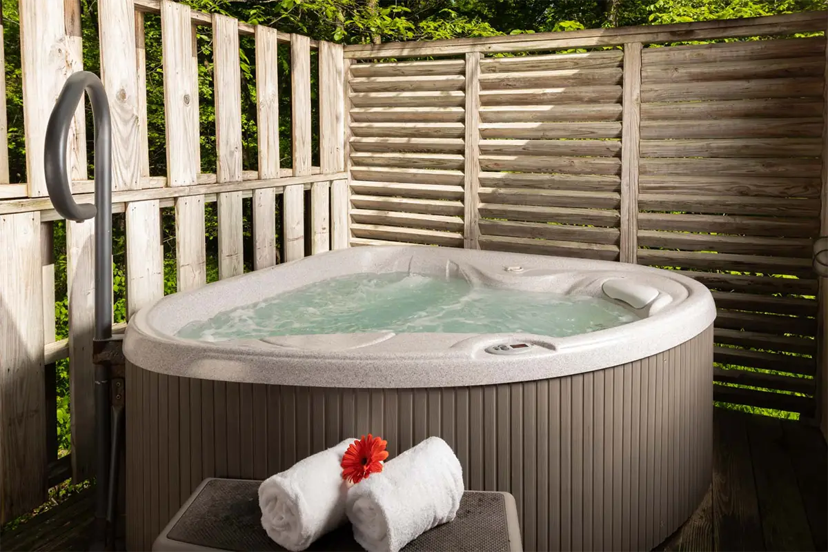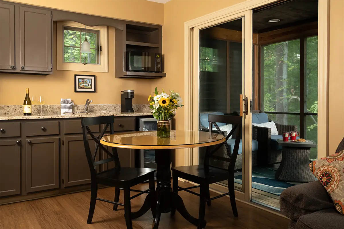 The living room’s large picture windows bring the woods right to you, and sliding glass doors open to a screened-in porch that feels like a tree house, perfect for slow mornings and long evenings. Just beyond, the private deck holds a hot tub positioned to look directly into the treetops, making a soak feel like you are tucked into the canopy. Inside, the kitchenette includes a dining table for two, plus a microwave, sink, refrigerator, coffee maker, toaster, and utensils, but no stove, making it ideal for light bites and relaxed pacing.