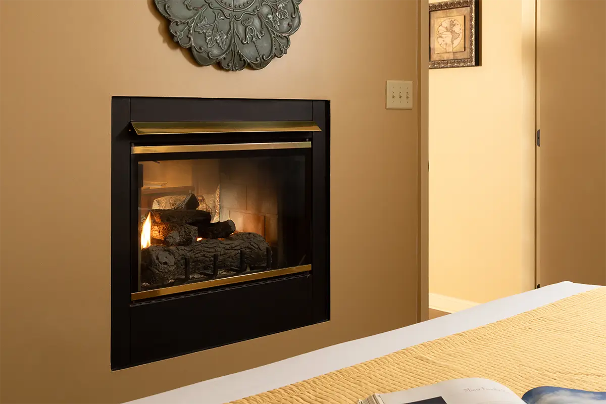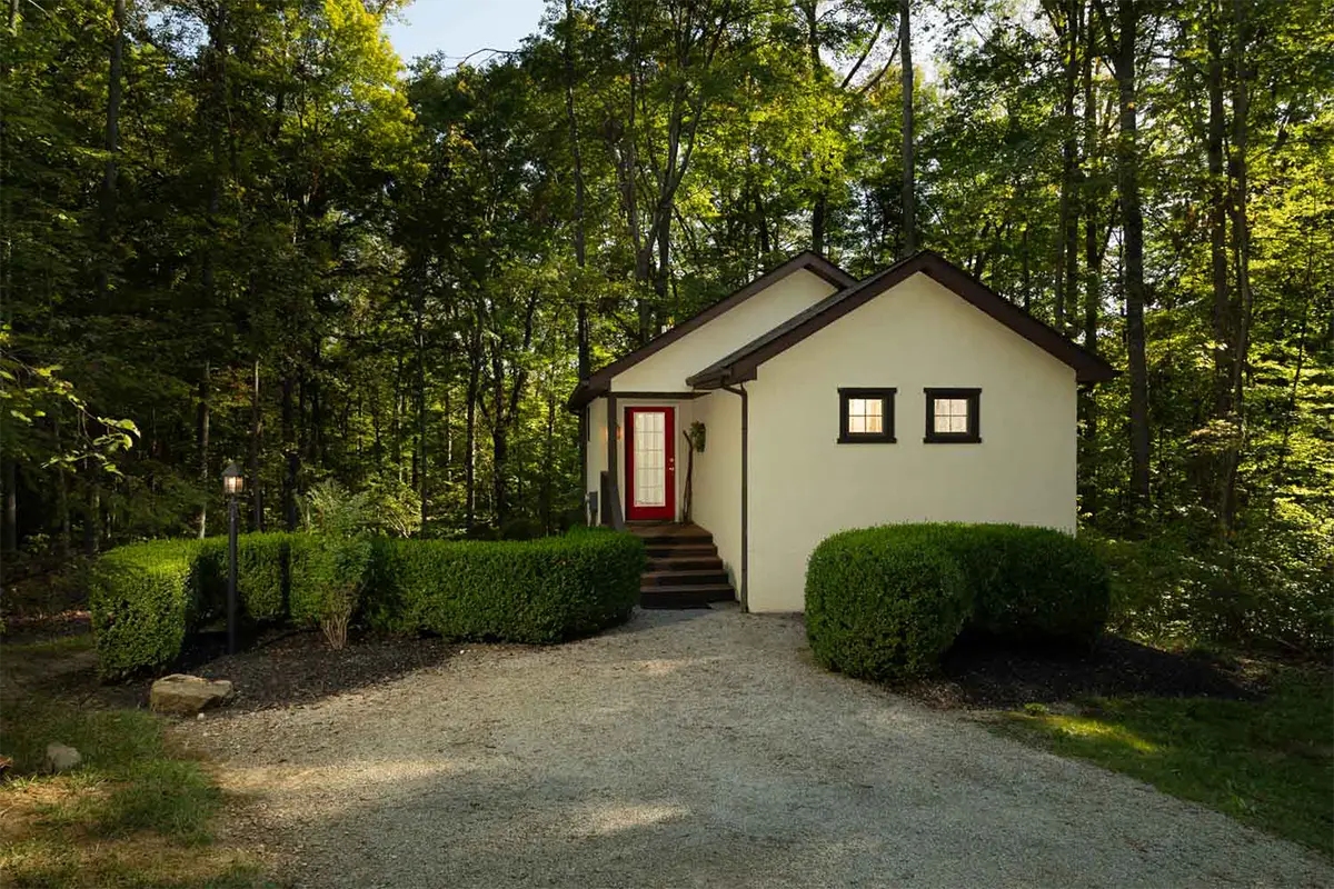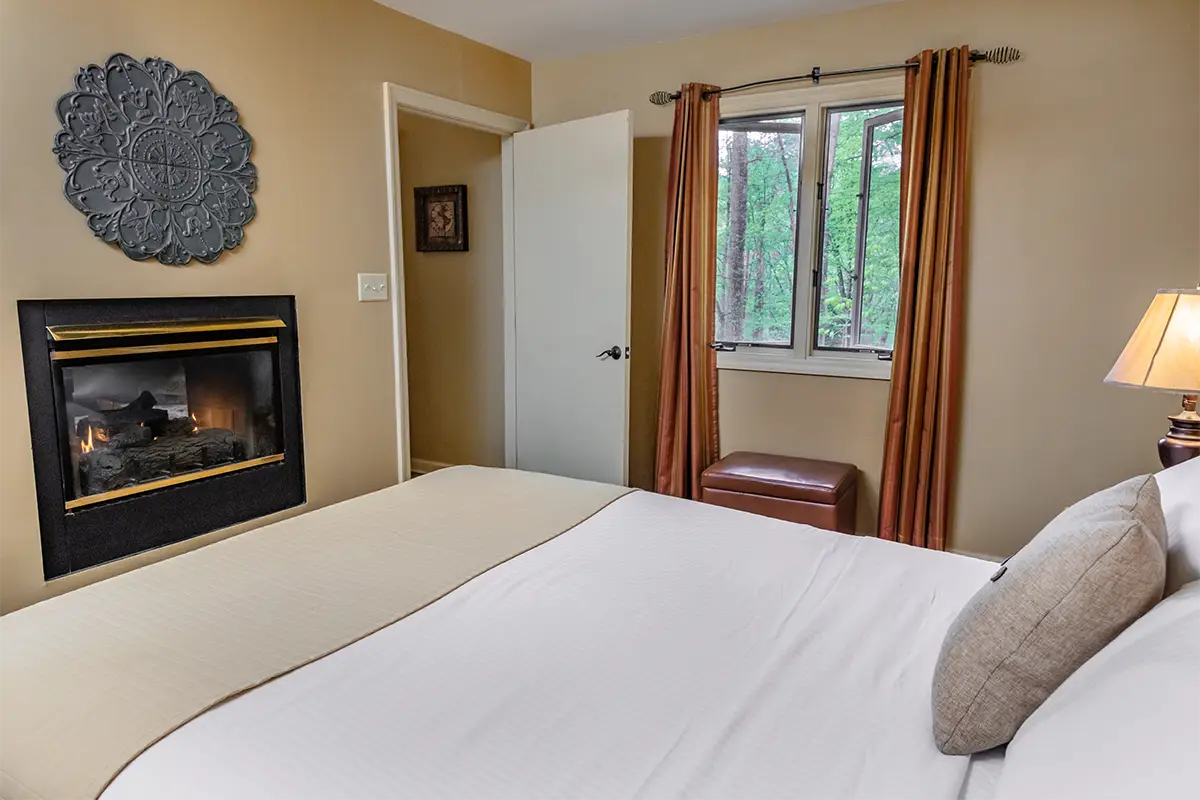 For couples who want a romantic Hocking Hills cabin surrounded by trees, The Elliot delivers a true woodland retreat with the comforts that make it easy to stay in. This East Croft is styled in soft, soothing colors and arranged around a see-through fireplace that glows between the bedroom and living room, setting a warm tone whether you are winding down on the sofa or settling in for the night.