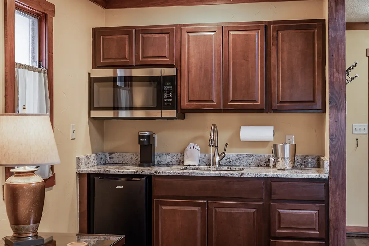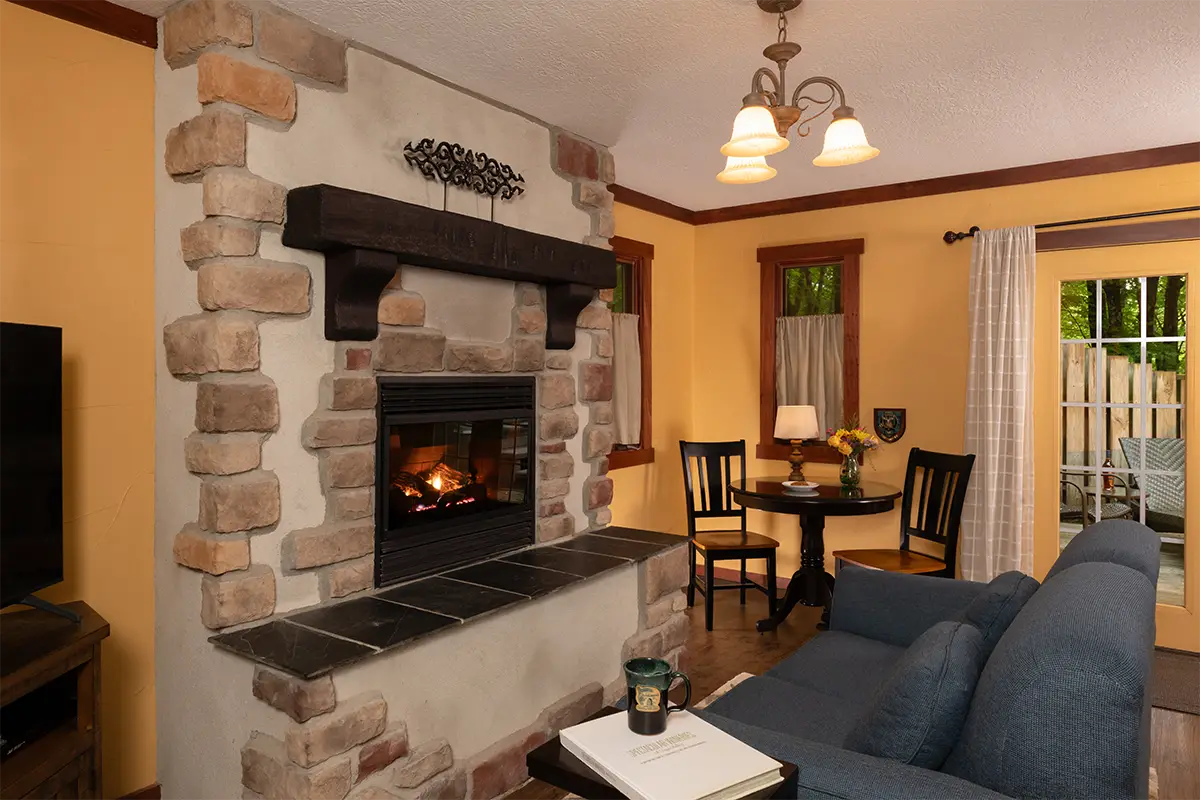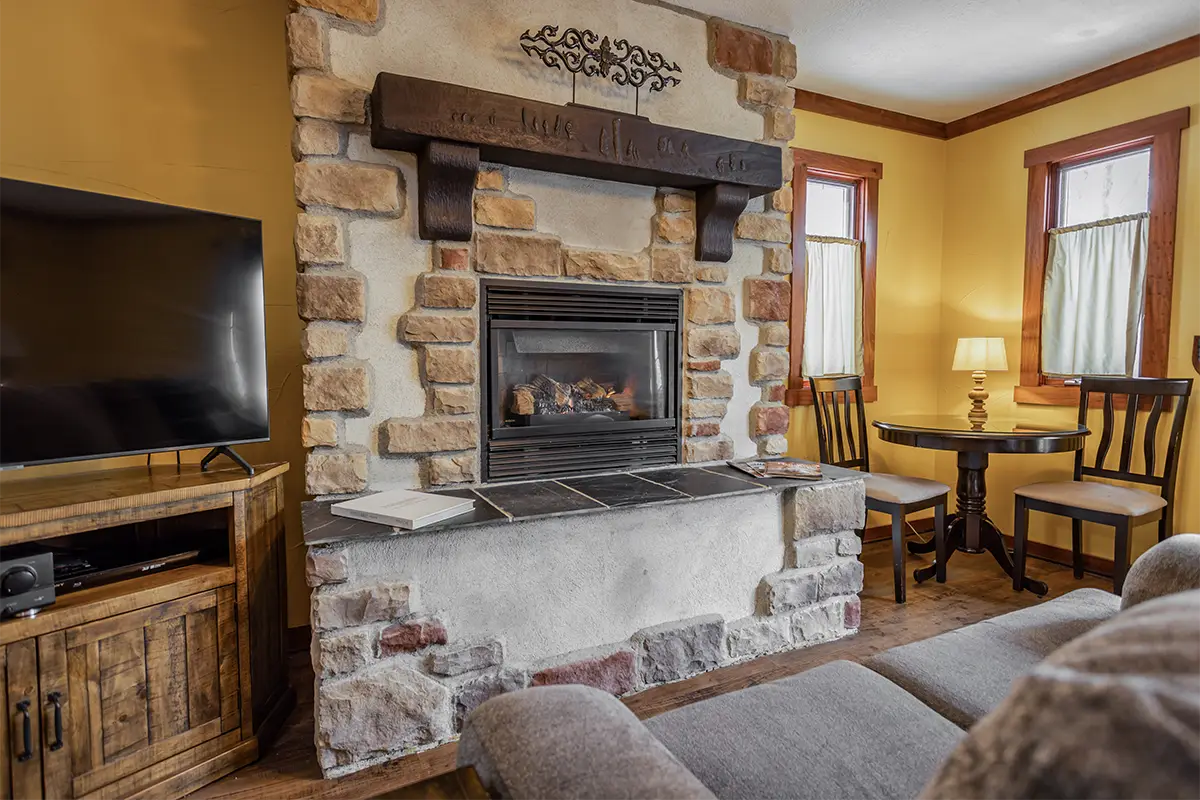 Rich maple-toned trim runs throughout the space, creating a welcoming feel that pairs beautifully with creamy, golden walls. In the living area, a loveseat faces the stone hearth and fireplace, inviting you to settle in and stay awhile, with a small drop-leaf table nearby that makes the space feel easy and lived in. The kitchenette keeps mornings simple, and the entertainment center with TV and DVD player makes movie nights effortless.