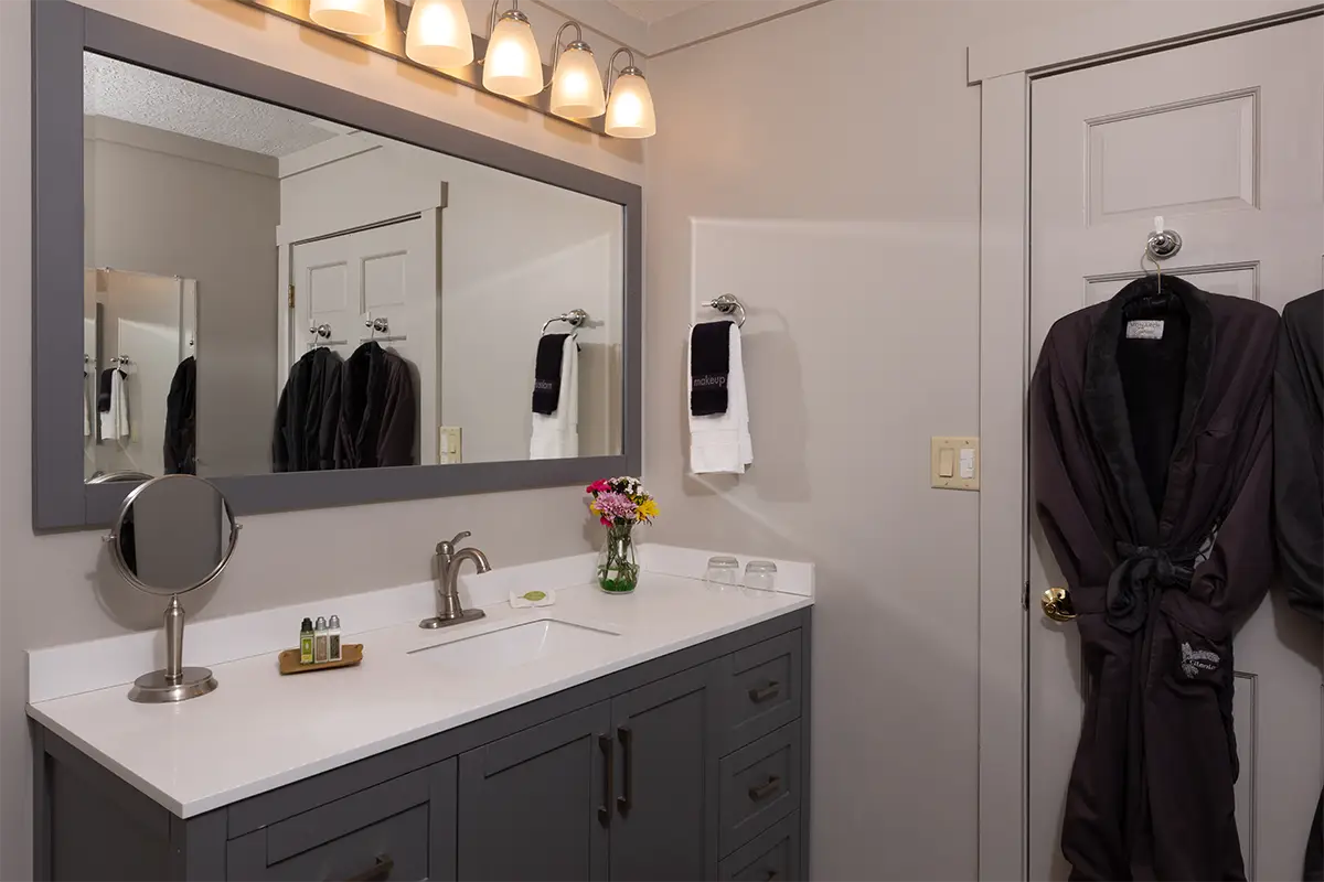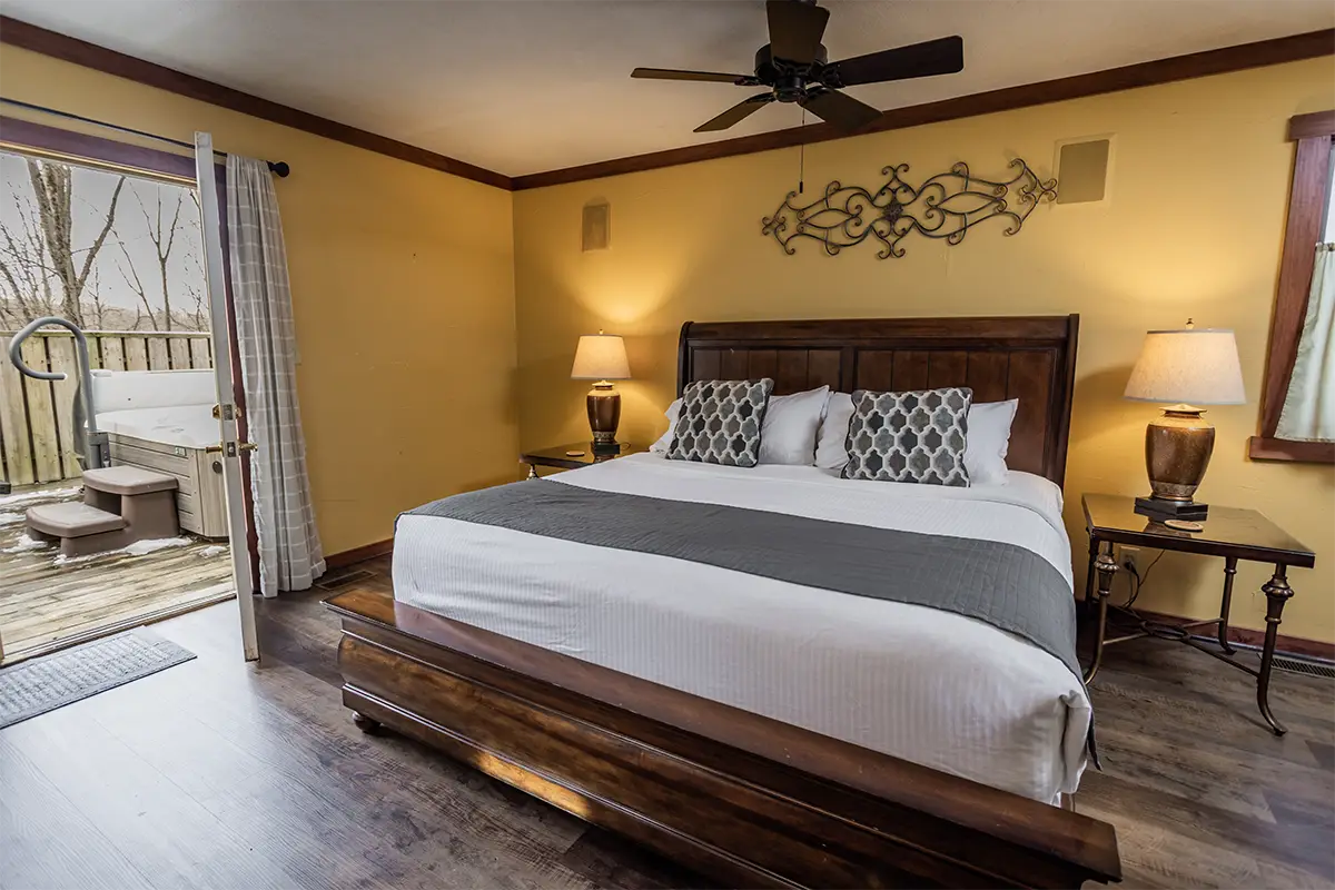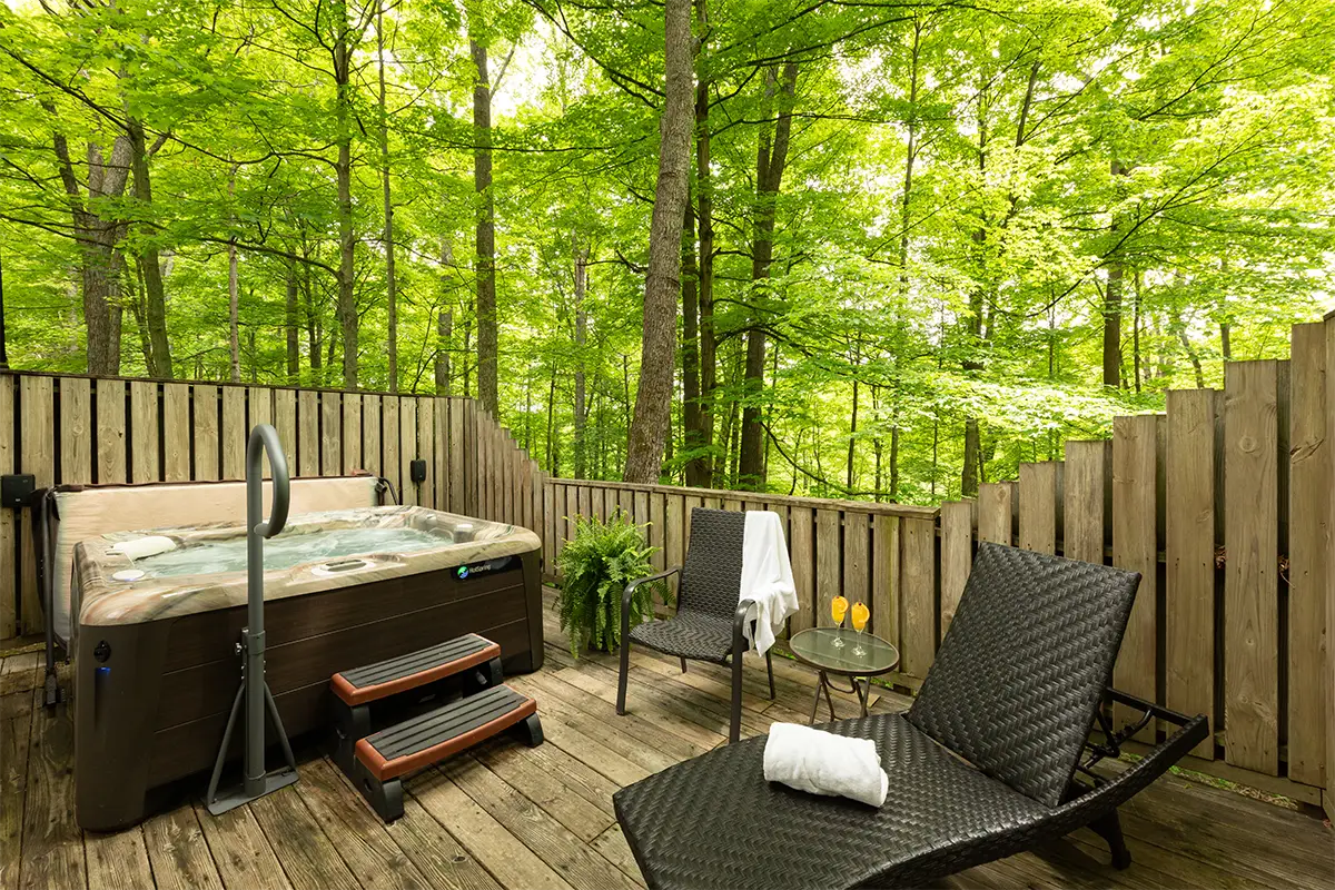 The spacious bathroom includes a two-person shower, plus plenty of room to spread out and slow down. Outside, your private deck and hot tub add the kind of finishing touch guests hope for when choosing places to stay in Hocking Hills.