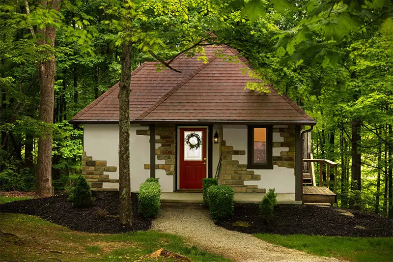 The Gordon West Croft is a cozy retreat, designed for couples who want warmth, privacy, and a little Scottish story woven into their Hocking Hills getaways. The Gordon clan was known as the magicians of the Highlands of Northeastern Scotland, and this elegant cabin leans into that spirit with standing stones pictured on the mantle, a fitting detail for a cottage set on the southwestern corner of the Hamlet.